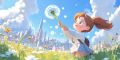 Joyful Child in a Vibrant Meadow Overlooking the Cityscape